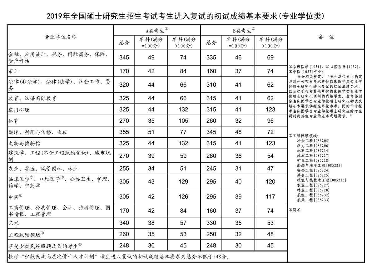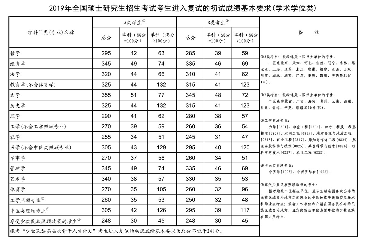 2019年全国硕士研究生招生考试考生进入复试的初试成绩基本要求